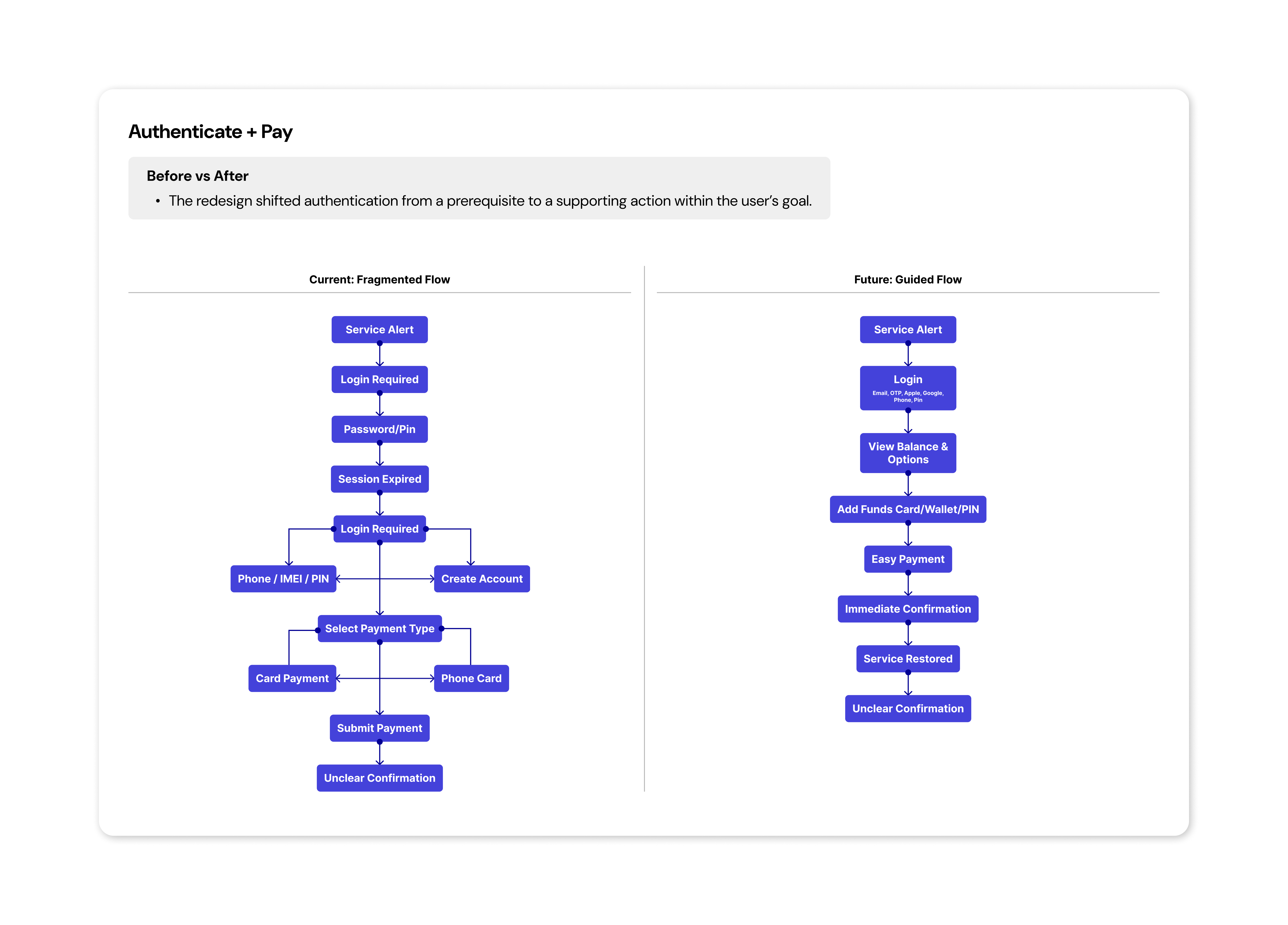 We mapped the end-to-end authentication and payment journey to identify where customers were blocked. The issue was continuity — users were forced to authenticate before completing an urgent task.