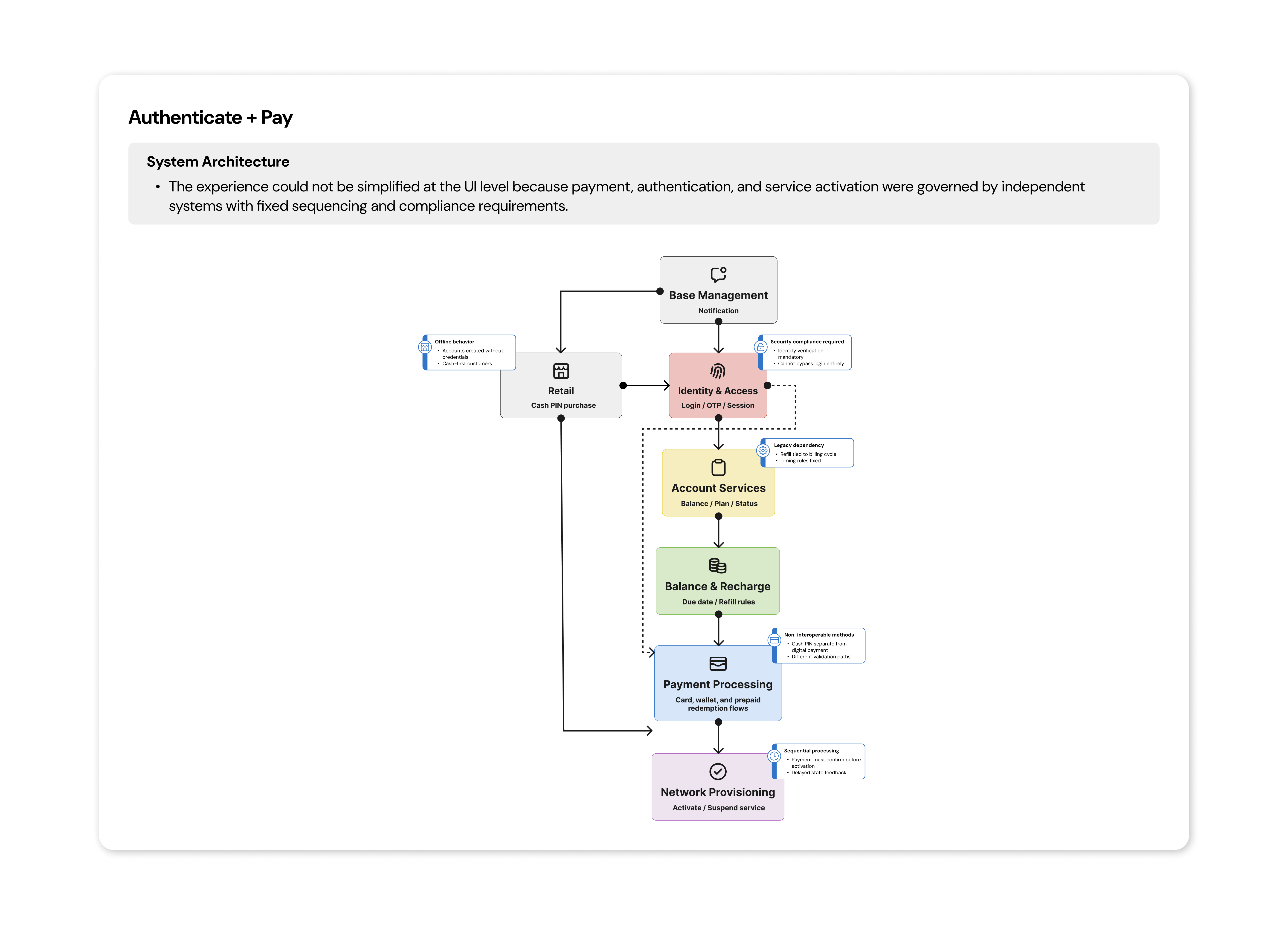 Authentication, billing, and payment systems operated independently and were governed by security and compliance requirements. Cash PIN payments were not interoperable with digital payment methods, and changes affected multiple downstream account workflows.