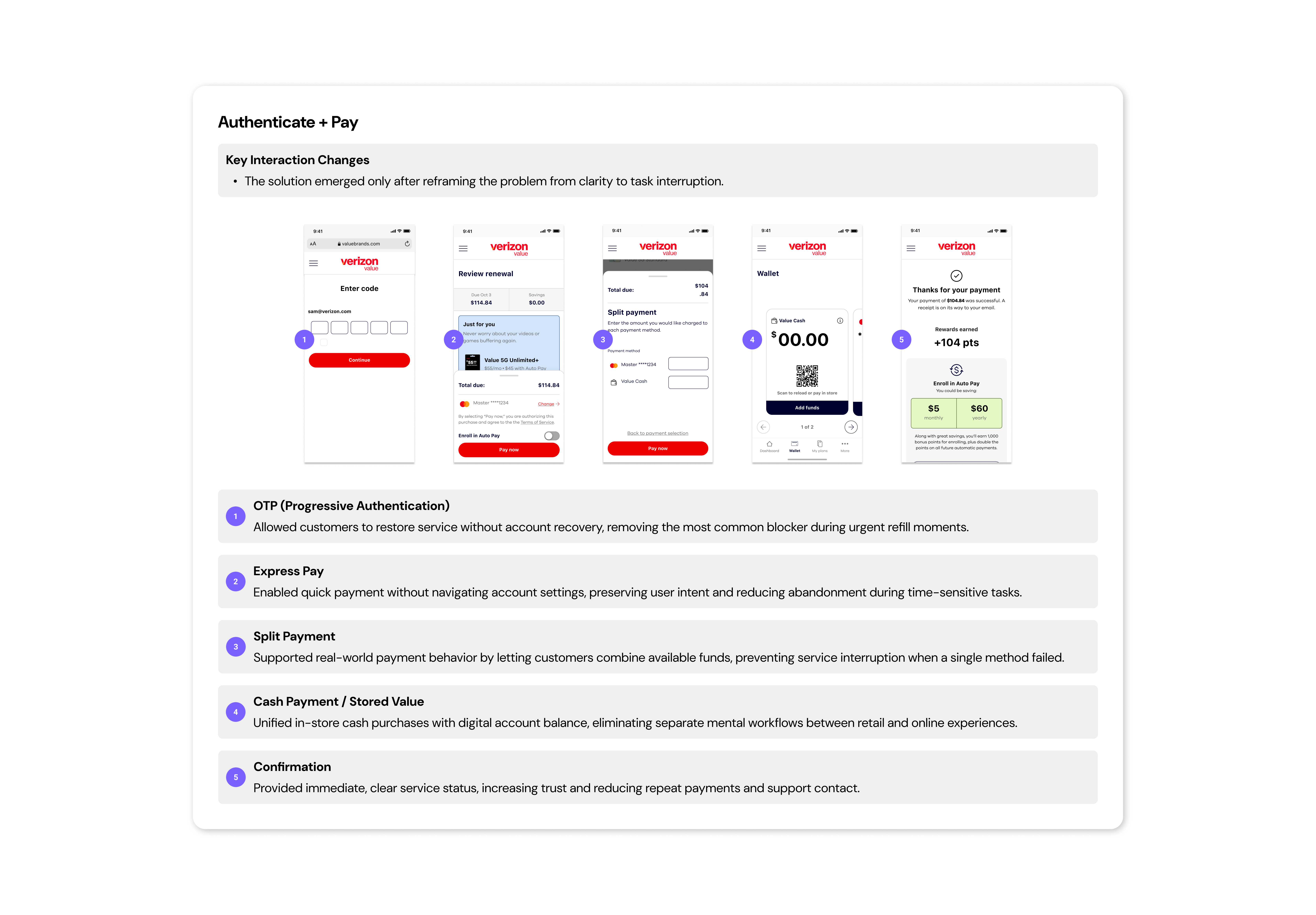 I led the redesign of the Authenticate + Pay experience for Verizon’s value brands, supporting prepaid customers as they accessed their accounts and refilled service. A large portion of payments occurred in-store using physical cash-based PIN cards, creating a disconnect between in-person and digital account management.